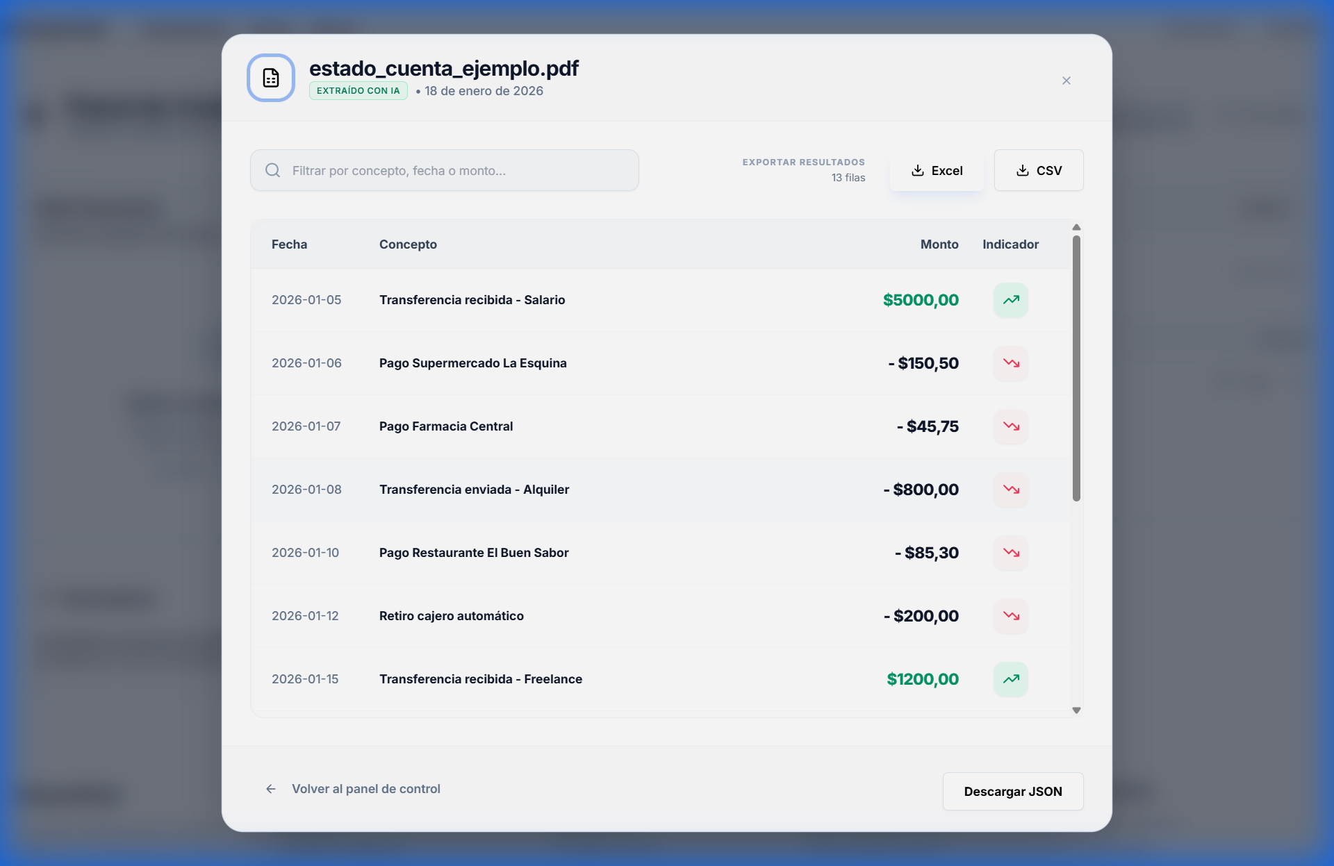 Nuestra IA extrae automáticamente fechas, conceptos y montos de cualquier estado de cuenta bancario con precisión absoluta. Ideal para conciliación bancaria.